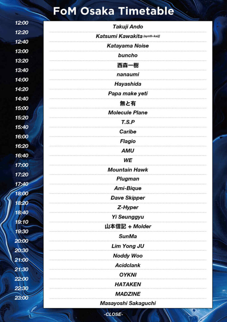 HATAKEN / Acidclank (Solo Set) / Z-Hyper / Dave Skipper / Masayoshi Sakaguchi / Ami-Bique / 山本信記 + Molder / Plugman / Mountain Hawk / 無と有 / AMU / Caribe / Flagio / WE / Papa make yeti / nanaumi / buncho / Hayashida / Molecule Plane / T.S.P / Katsumi Kawakita / Katayama Noise / 西森一樹 / Takuji Ando